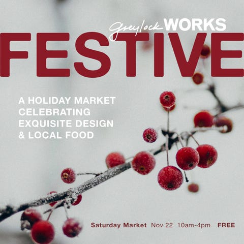 FESTIVE HOLIDAY MARKET @ Greylock WORKS Saturday, NOVEMBER 22nd, 10 AM – 4 PM, FREE Immerse in beautiful and delicious goods at the return of Greylock WORKS’ FESTIVE Holiday Market celebrating the handcrafted magic of the Berkshires and beyond. Set in an expansive, light-filled former-mill, the 30,000 square foot open market will include mouth-watering fresh food, farmers, fermenters, and the region’s best artisan makers.