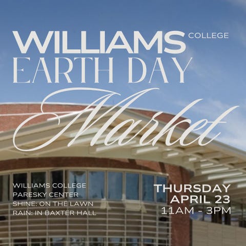 Don't miss the Williams College Earth Day Market @ the Paresky Center Support local + artisan made, right in the heart of Williams College. Find the perfect gift or treat yourself, with sustainability in mind. Shop this intimate handmade + vintage market including mouthwatering truffles, gemstone jewelry, curated vintage, hand-poured soy candles, artisanal ceramics, and more! Snacks and seasonal beverages to enjoy as well. Open to all, and ALL are welcome! When: Thursday, April 23, 11am - 3pm